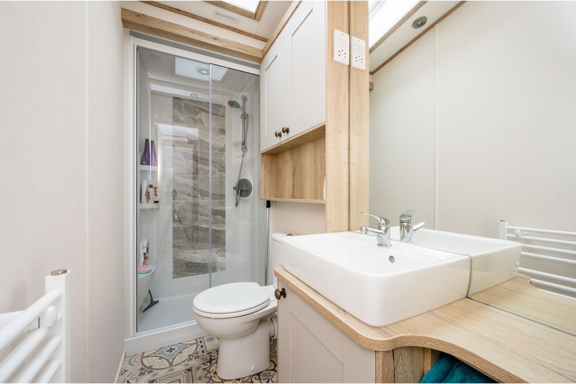 The second bedroom has 3ft twin beds with a good-sized wardrobe and a stylish dressing table. The main bathroom has a large shower cubicle, a WC and wash basin which again is mounted on a useful cupboard. There is storage space too with a shelf above the WC and cupboards above that.