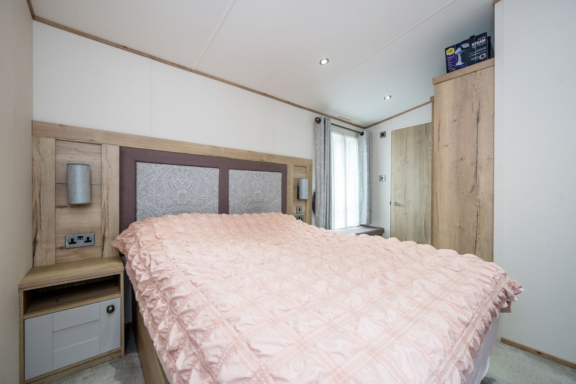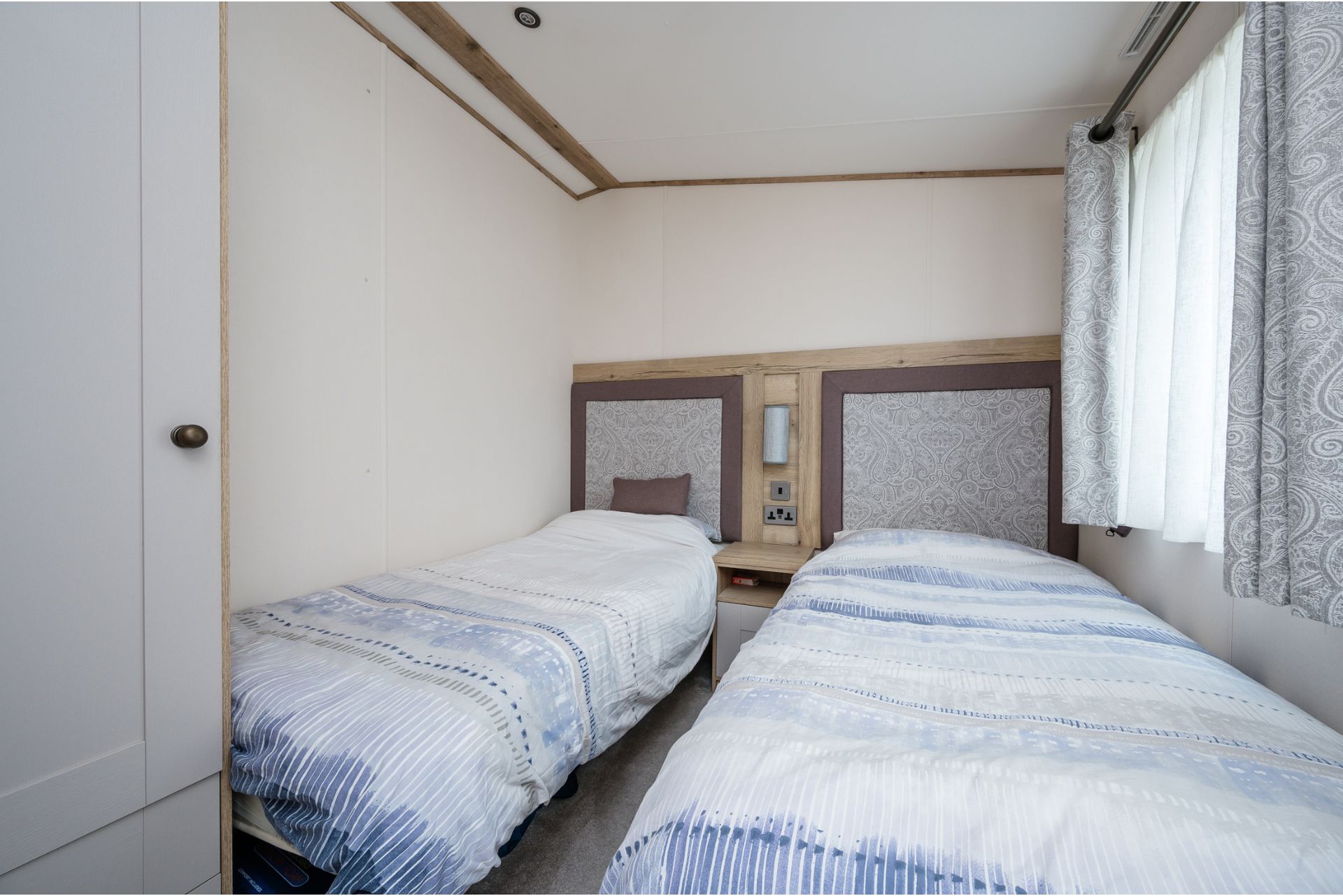The master bedroom will make you as comfortable on holiday as you would be at home. The bed lifts up for additional storage if required, while the tall wardrobes provide ample hanging space. There is also a dressing table with a mirror, upholstered stool with drawers to the side and storage above. The master is en-suite with shower, WC and a wash basin which is mounted on a handy storage cupboard. There is shelving for your bathroom necessities and the towel rail will keep your towels warm.