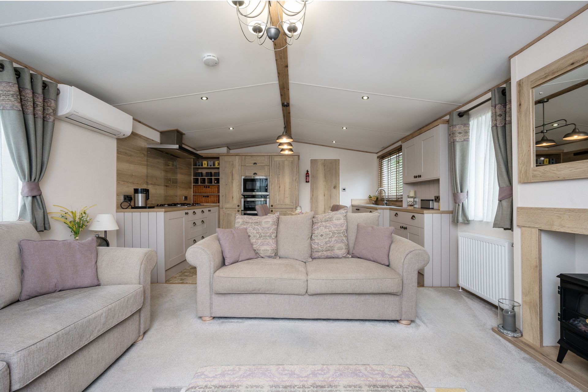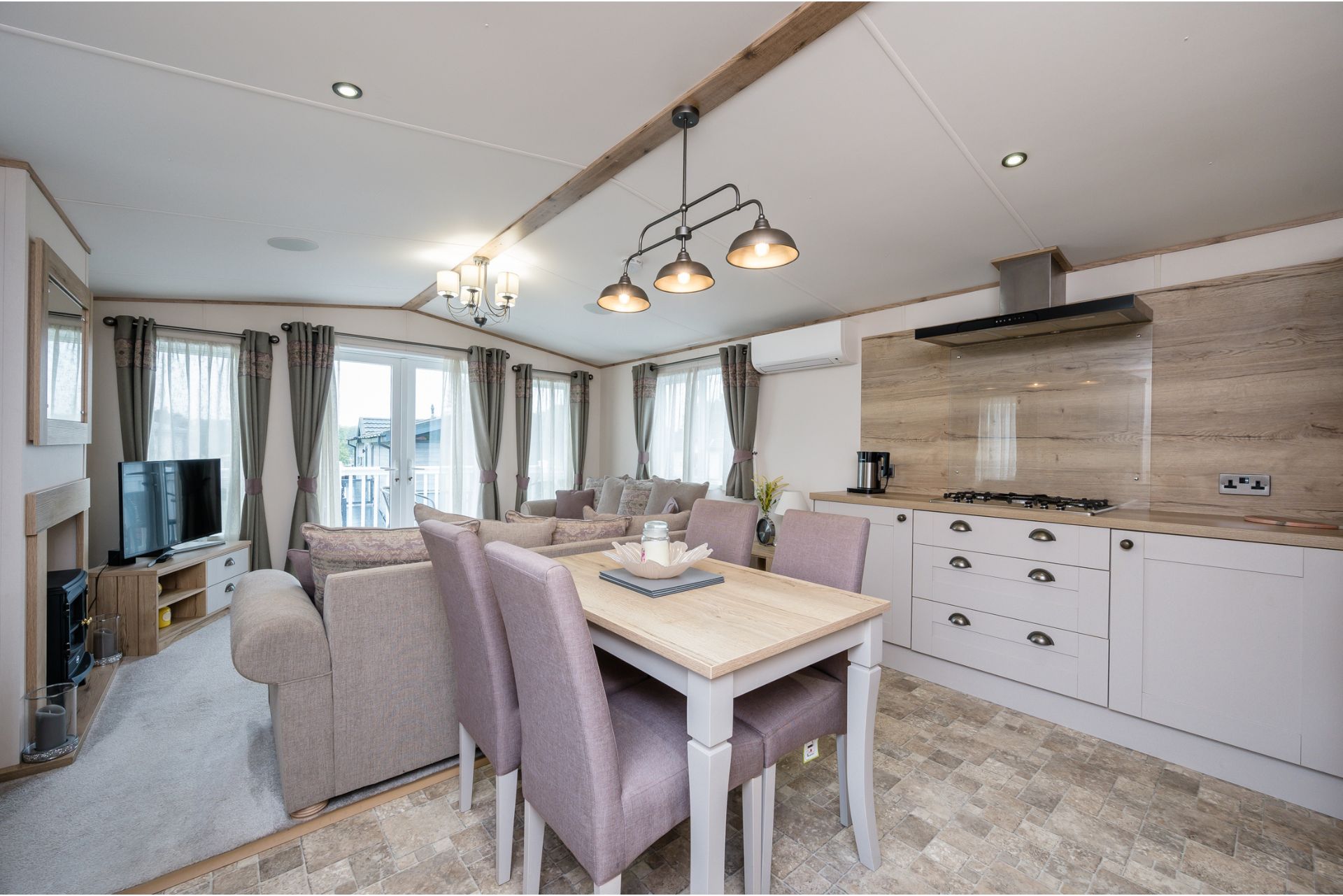 Front opening patio doors allow lots of natural light in, leaving the living area feeling bright and spacious. The cosy log burner style electric fire, and large comfy sofas make the living room the perfect place to relax and unwind, with the additional Bluetooth sound system making it easy to listen to your favourite music or watch a film – perfect for those rainy days.