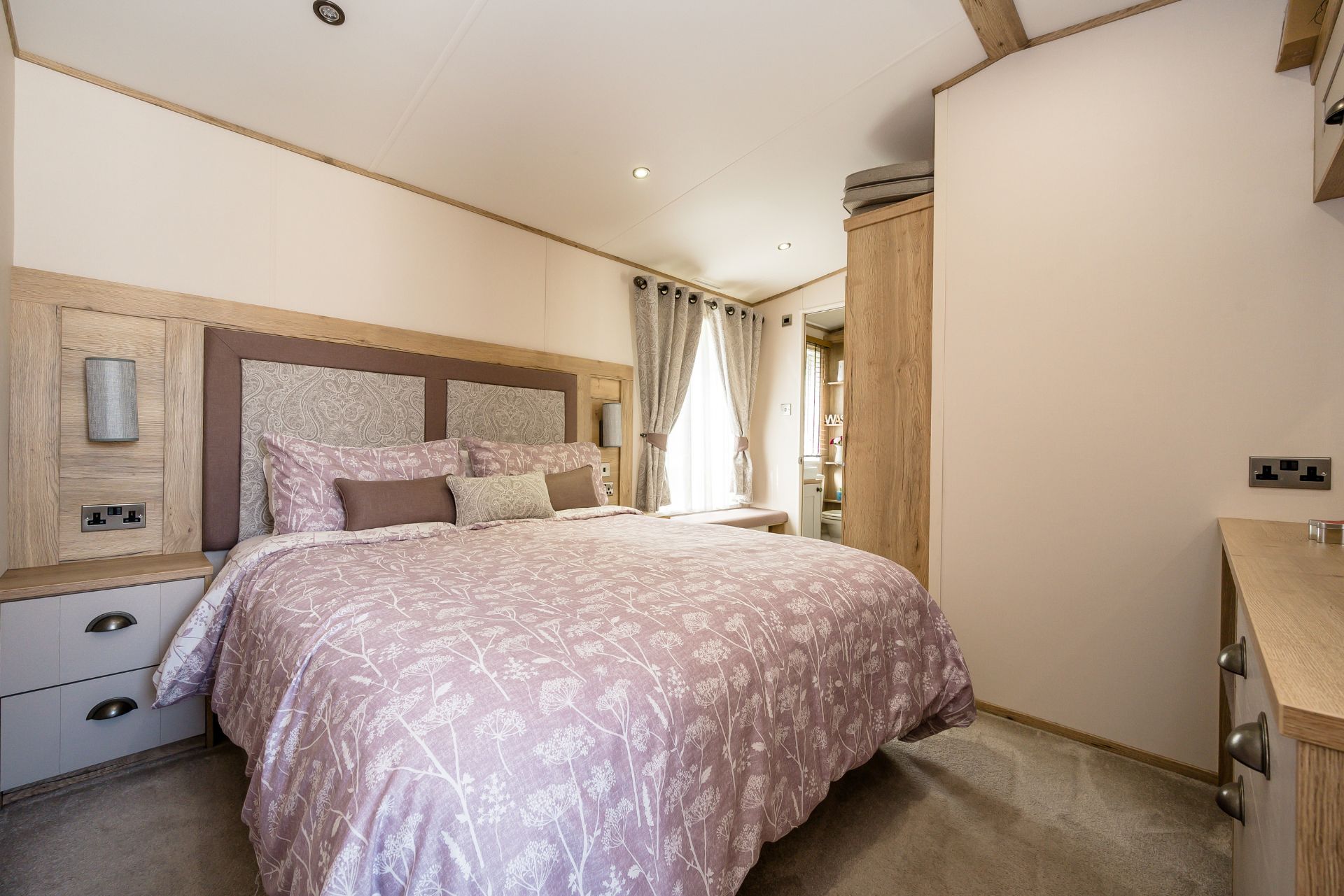 Internally the caravan benefits from an open plan living area, with comfortable sofas, a real home from home; dining table and chairs, and a fully equip kitchen with an oven, fridge freezer, washer, dishwasher. The lodge has two bedrooms, one with a double bed and ensuite bathroom (with shower); the second bedroom is spacious with twin beds. There is also a separate main bathroom with shower.