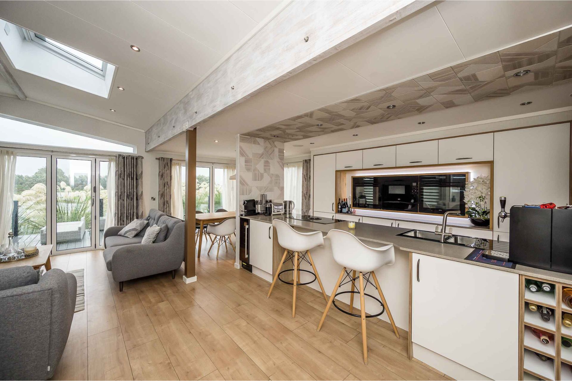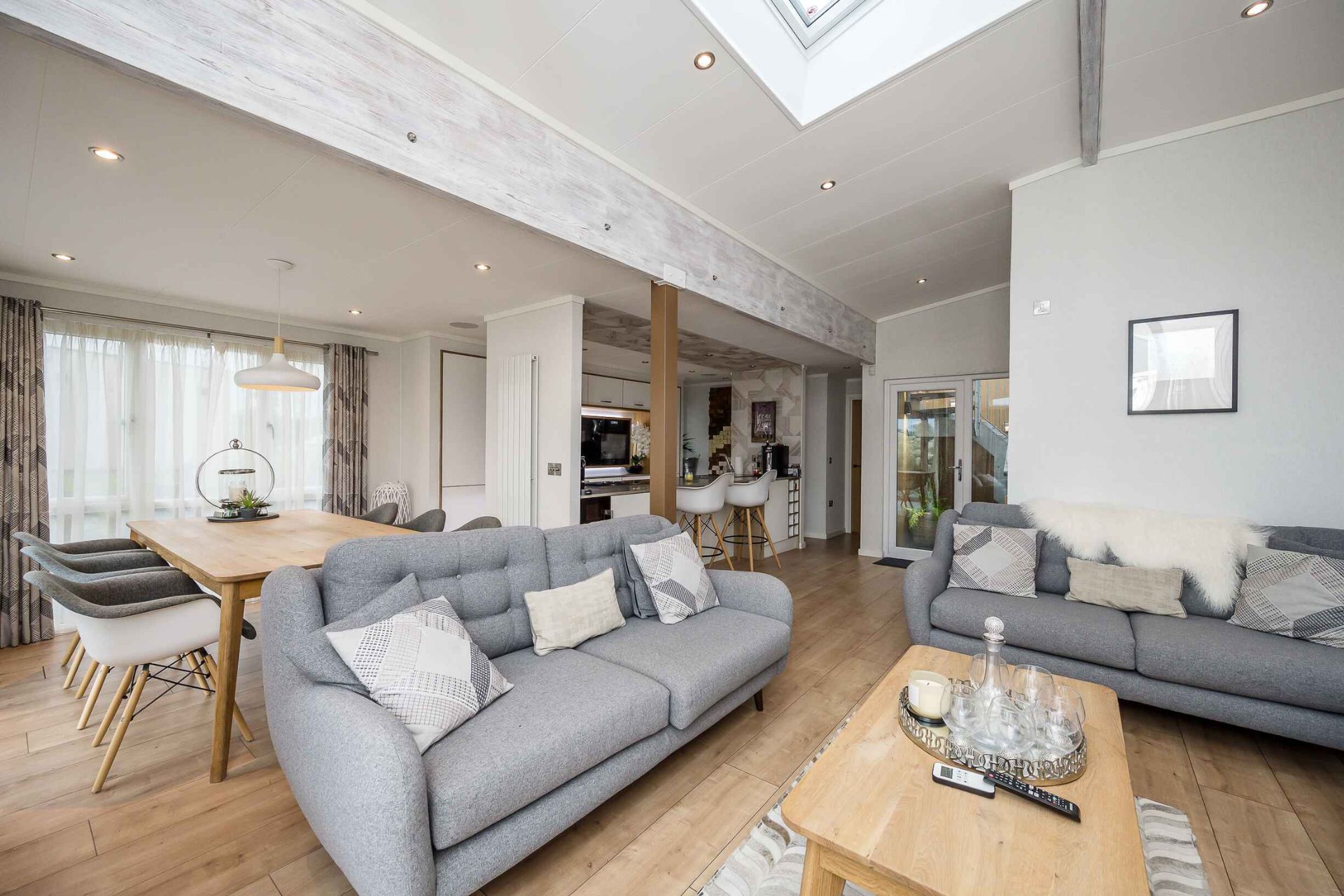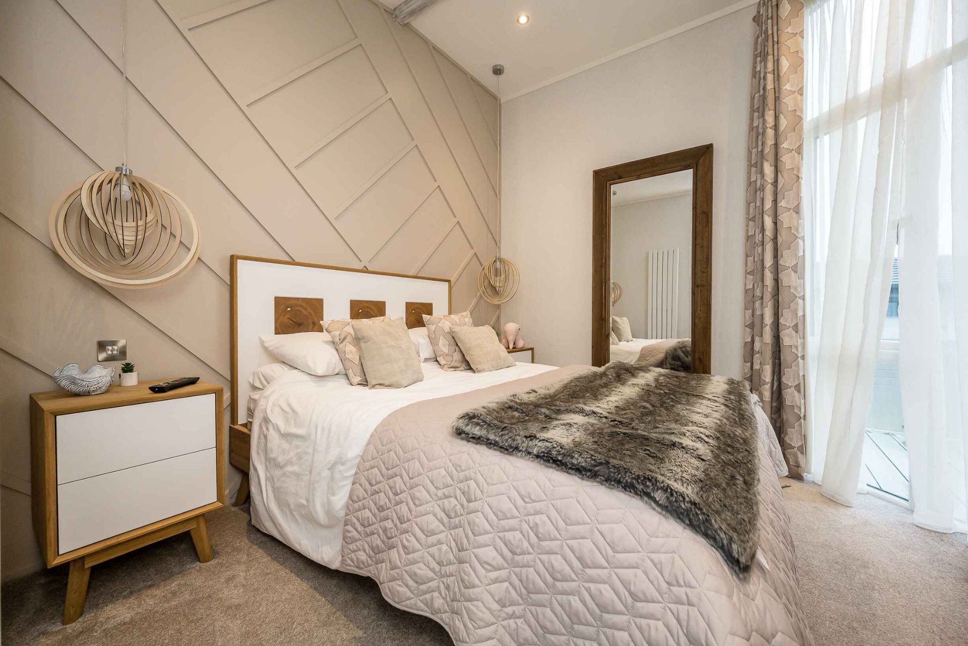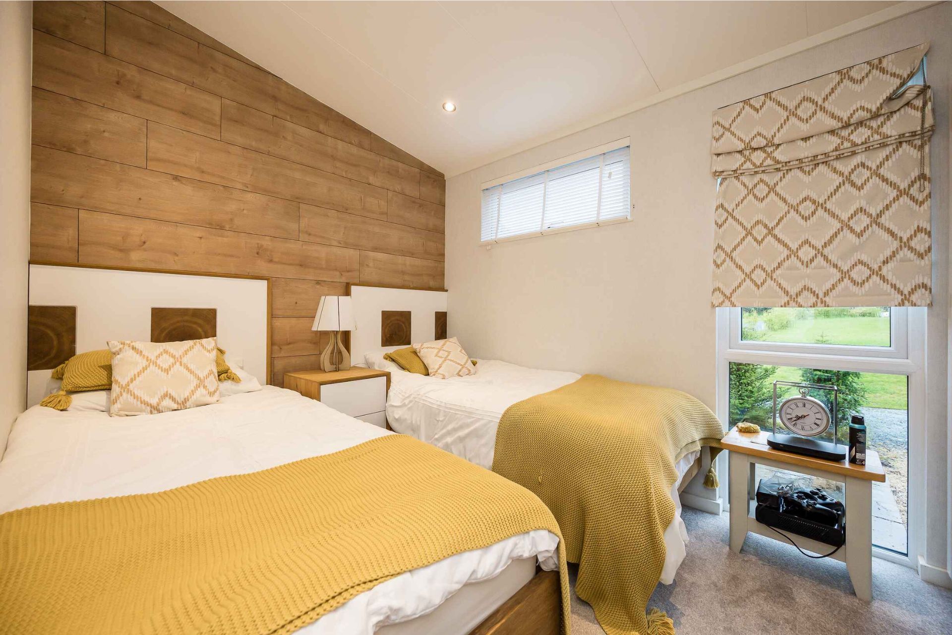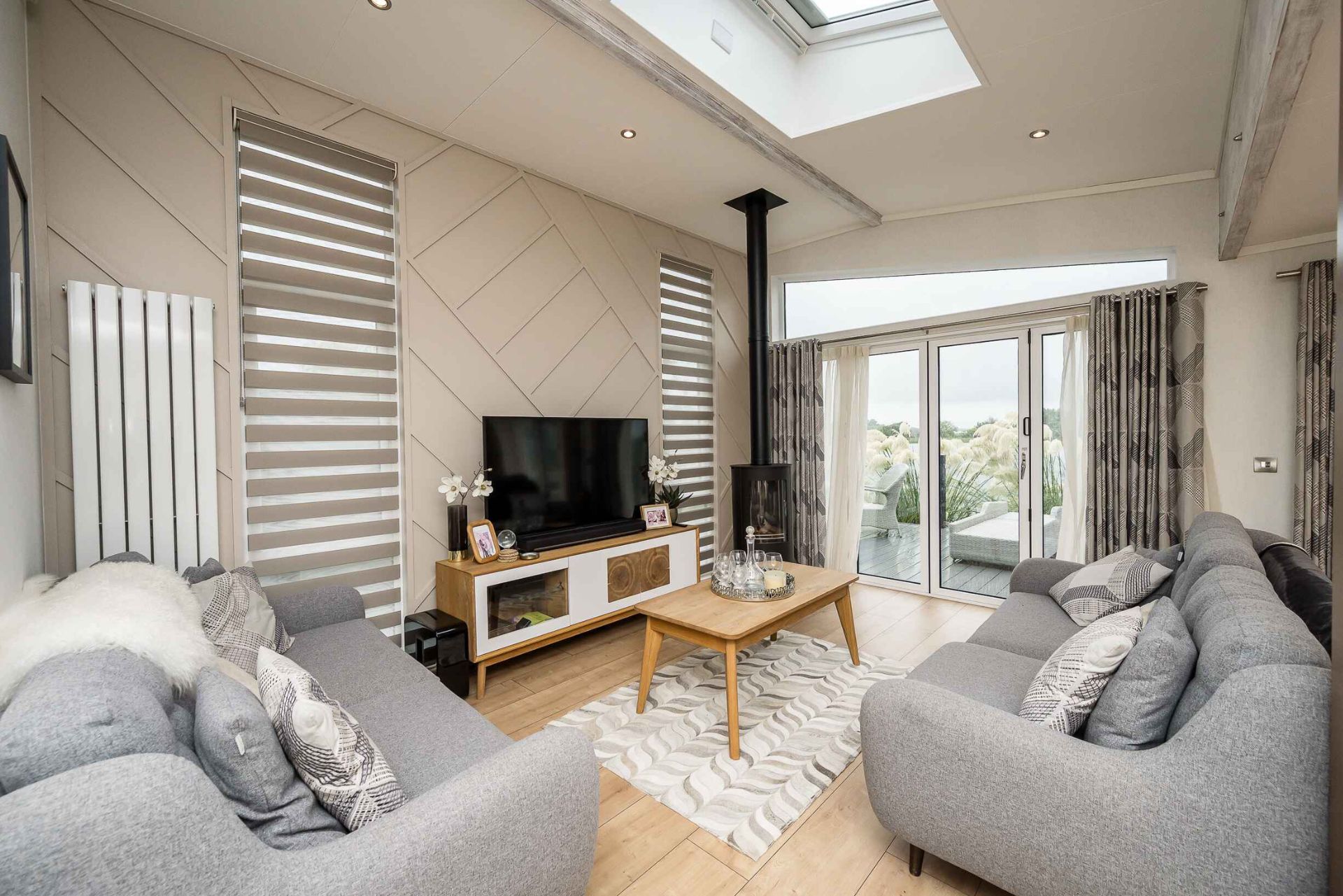 The second bedroom has a double bed, whilst the third bedroom has two single beds, perfect for children. The family bathroom has a contemporary bath as well as a shower. The muted and neutral colour palette, warm textures and modern Scandi-influences combine to make this lodge a visual treat and create a calming atmosphere to relax.