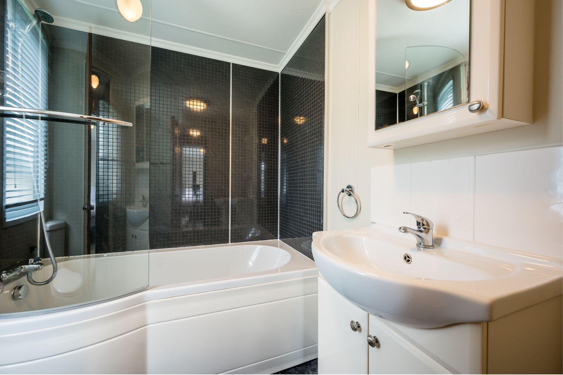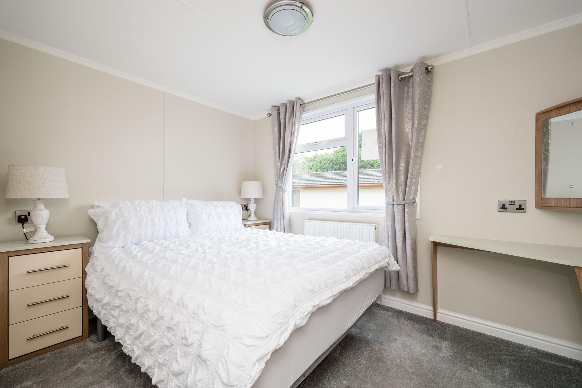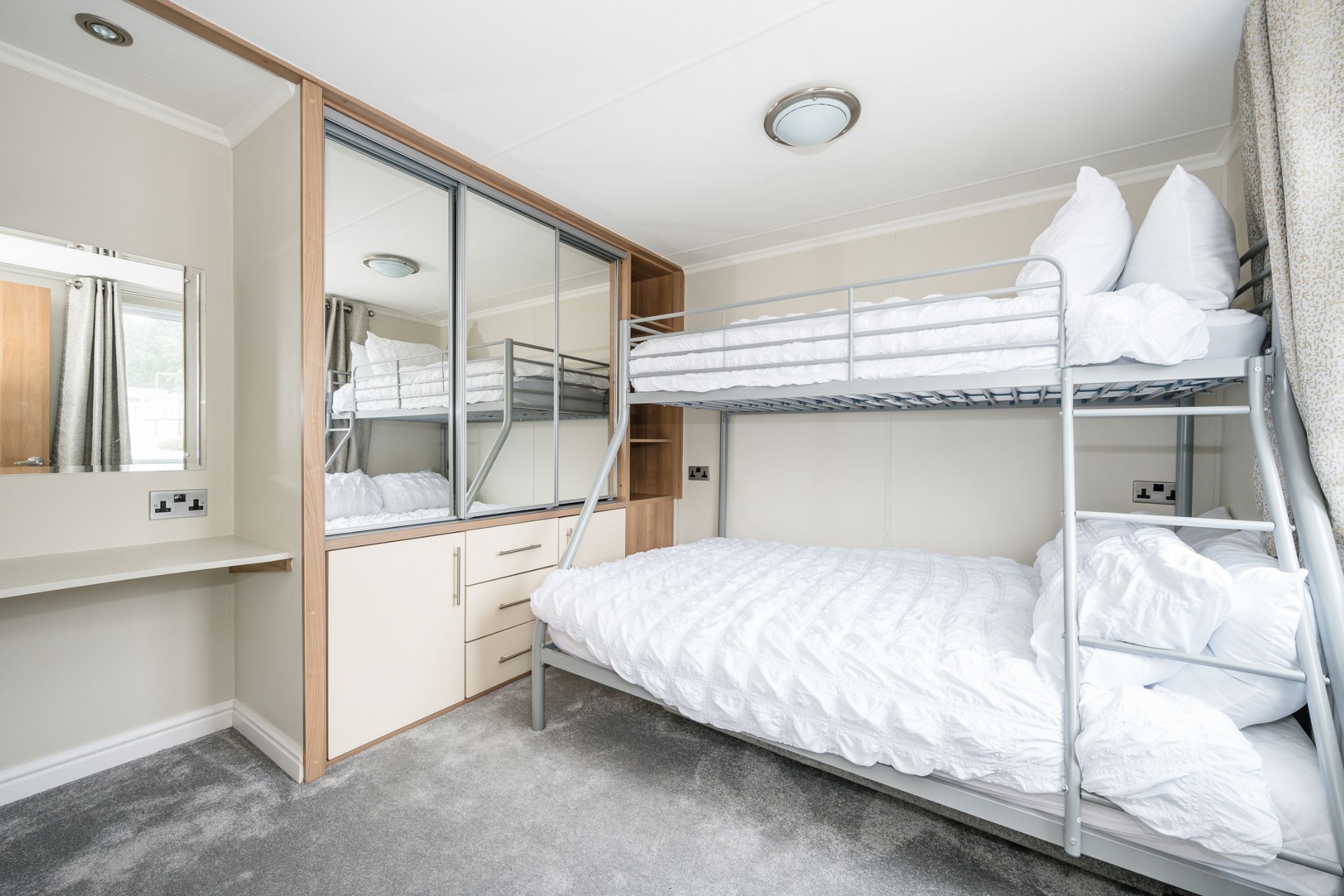 The lodge has spacious and comfortable sleeping arrangements. The master is en-suite with a bath, accessed by the walk-through wardrobe with ample storage.  The second bedroom is light and airy and hosts bunk beds, the lower benefitting from being a double, also offering plenty of storage with a fitted wardrobe and drawers. As well as the en-suite there is a separate family shower room.