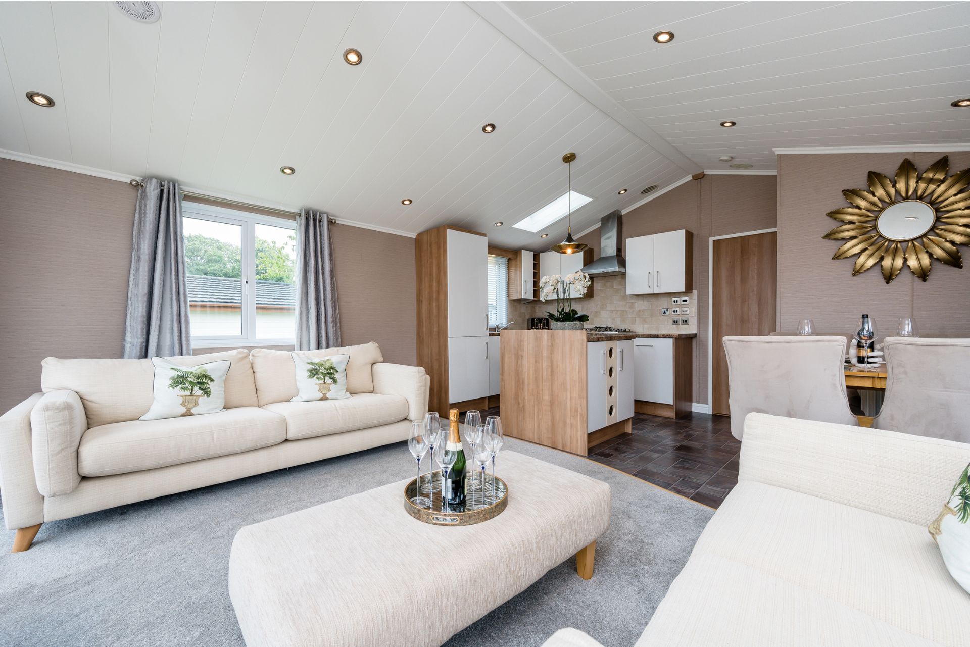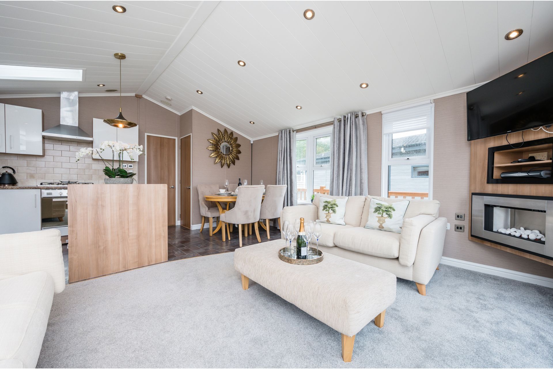The lounge is warm and inviting with a luxurious carpet, freestanding footstool with two matching sofas, perfect for curling up in front of the electric fire and enjoying the view out onto your decking from the front patio doors.