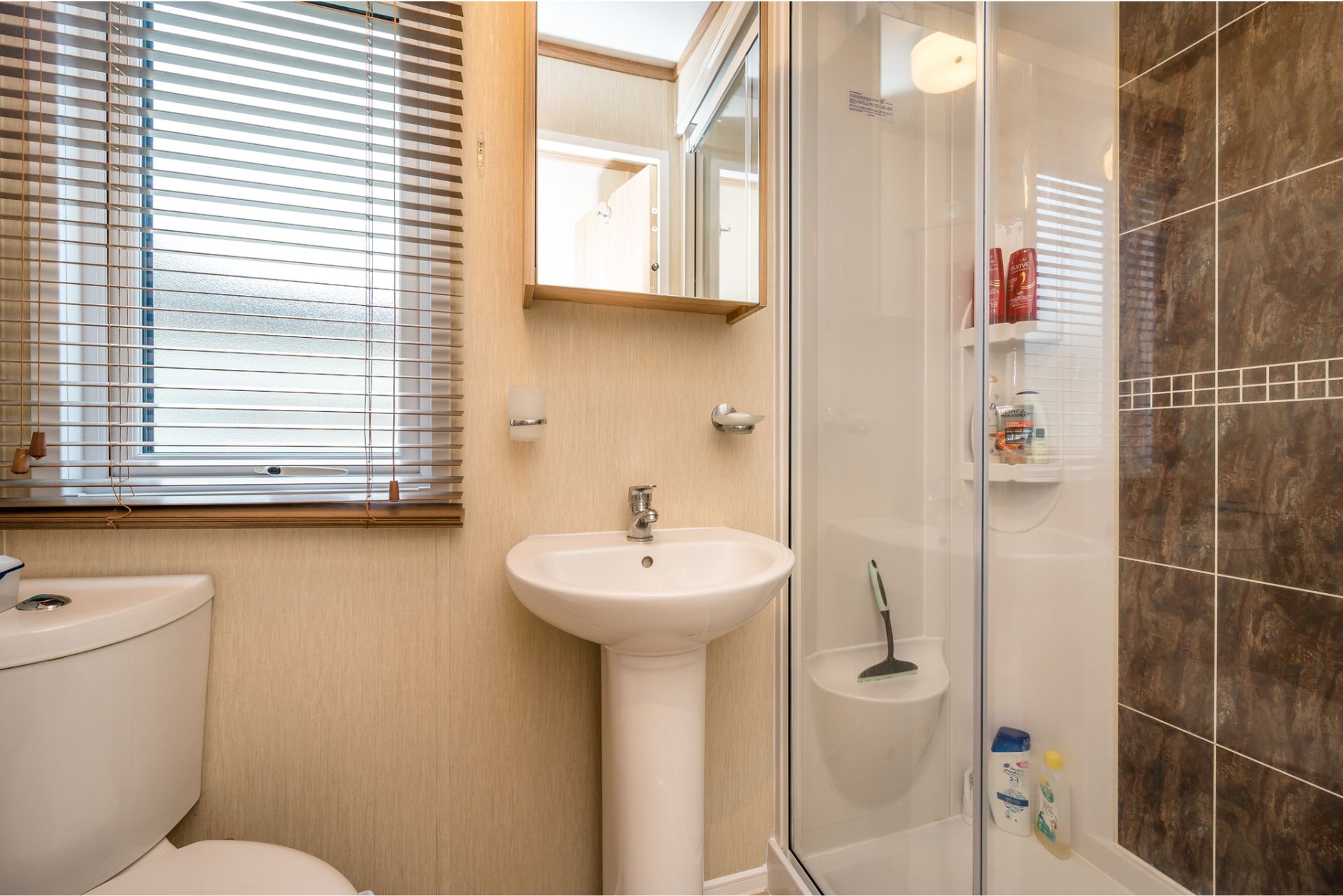 The second bedroom has twin beds with overhead storage as well as a wardrobe. The main bathroom has a wash basin with a mirror fronted cabinet above, WC and shower.