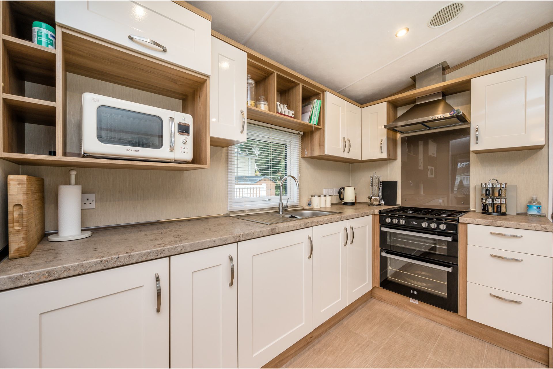 The Marlow is a spacious holiday home with an open plan layout and warm oak wood effects to add to the luxurious feel. If you enjoy home cooked meals, you will be impressed with the L shaded kitchen with lots of work top space and integrated appliances. Enjoy meals as a family around the freestanding glass top dining table with plush velvet chairs, complementing the high gloss shaker style cabinets in the kitchen.