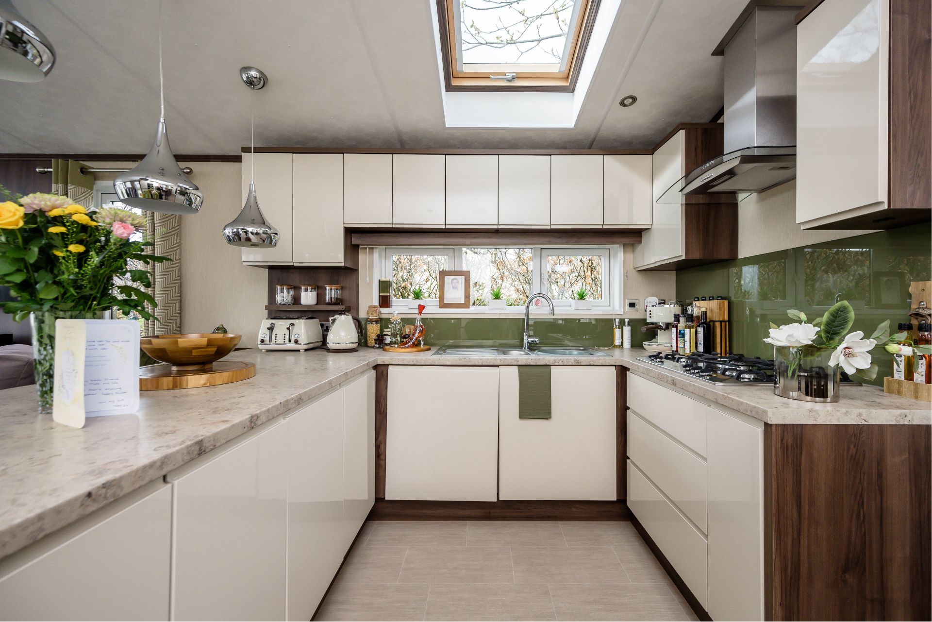 • Large U shaped kitchen with glass splashback and skylight