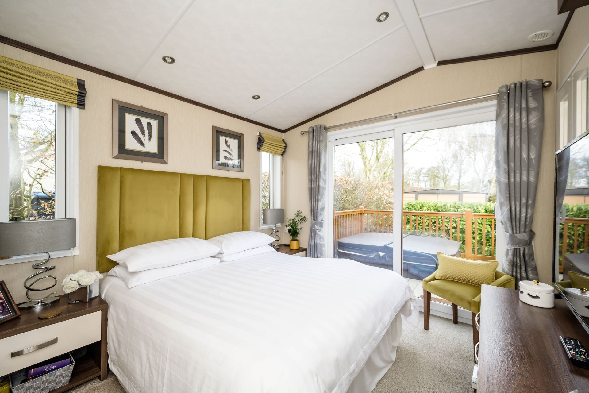 walk in wardrobe and large dressing table with a new styled vanity. A sunken hot tub on the decking for relaxing with the family. The back of the lodge has lots of green open space perfect for kids to play.