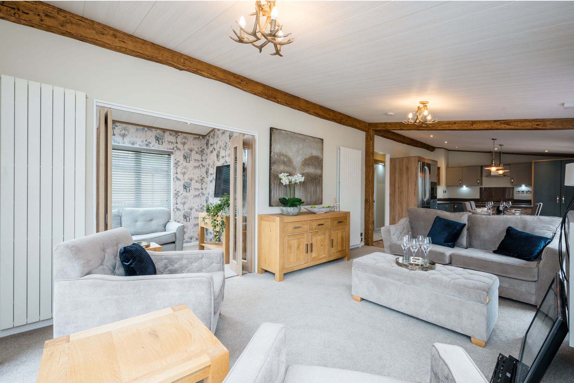 This is a truly panoramic home that lets the outside in from the large windows and bifold doors to the front aspect. As you step into the lodge to the kitchen you will find the rich colours and textures of the units and worktop all brought together with the parquet effect flooring and rustic beams. There is a host of integrated appliances such as a large fridge freezer, dishwasher, washing machine and microwave. The kitchen island is a great addition adding additional work top space. Through to the lounge you will find the wall mounted electric fire adding to the cosy atmosphere, with plenty of seating on offer from the freestanding sofa, two chairs and footstool. There is more on offer for the living space from the snug which has wall mounted shelves and can be used as an extra bedroom, an office or a tranquil reading room.