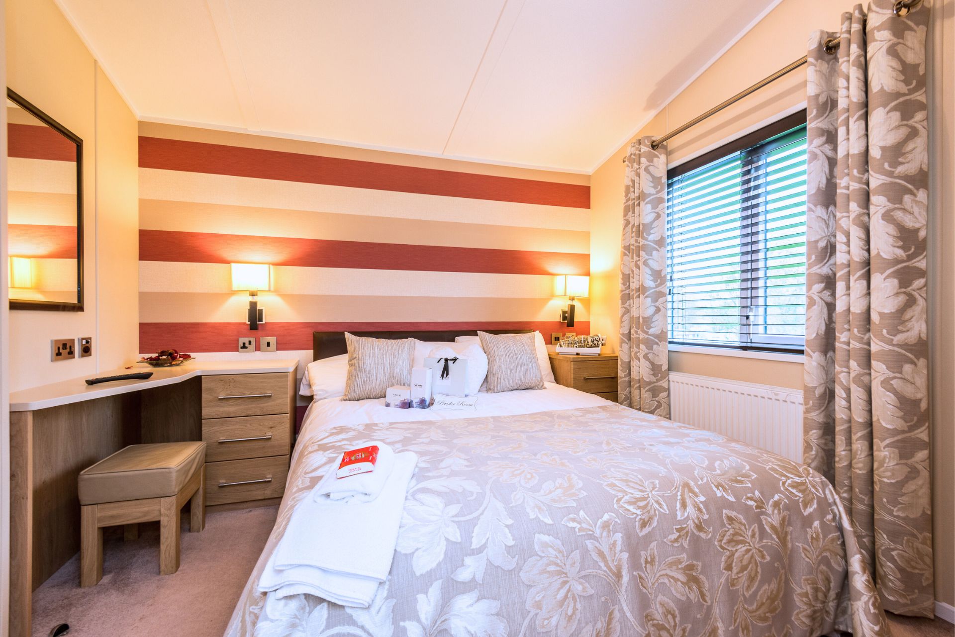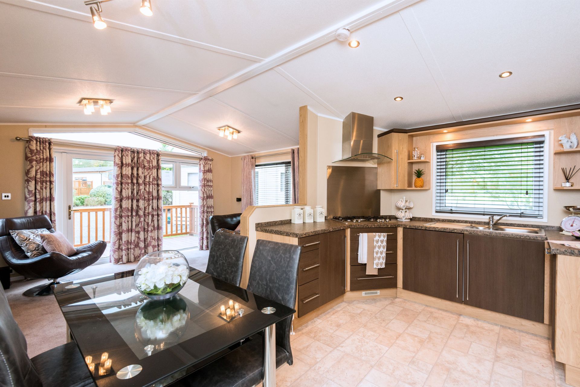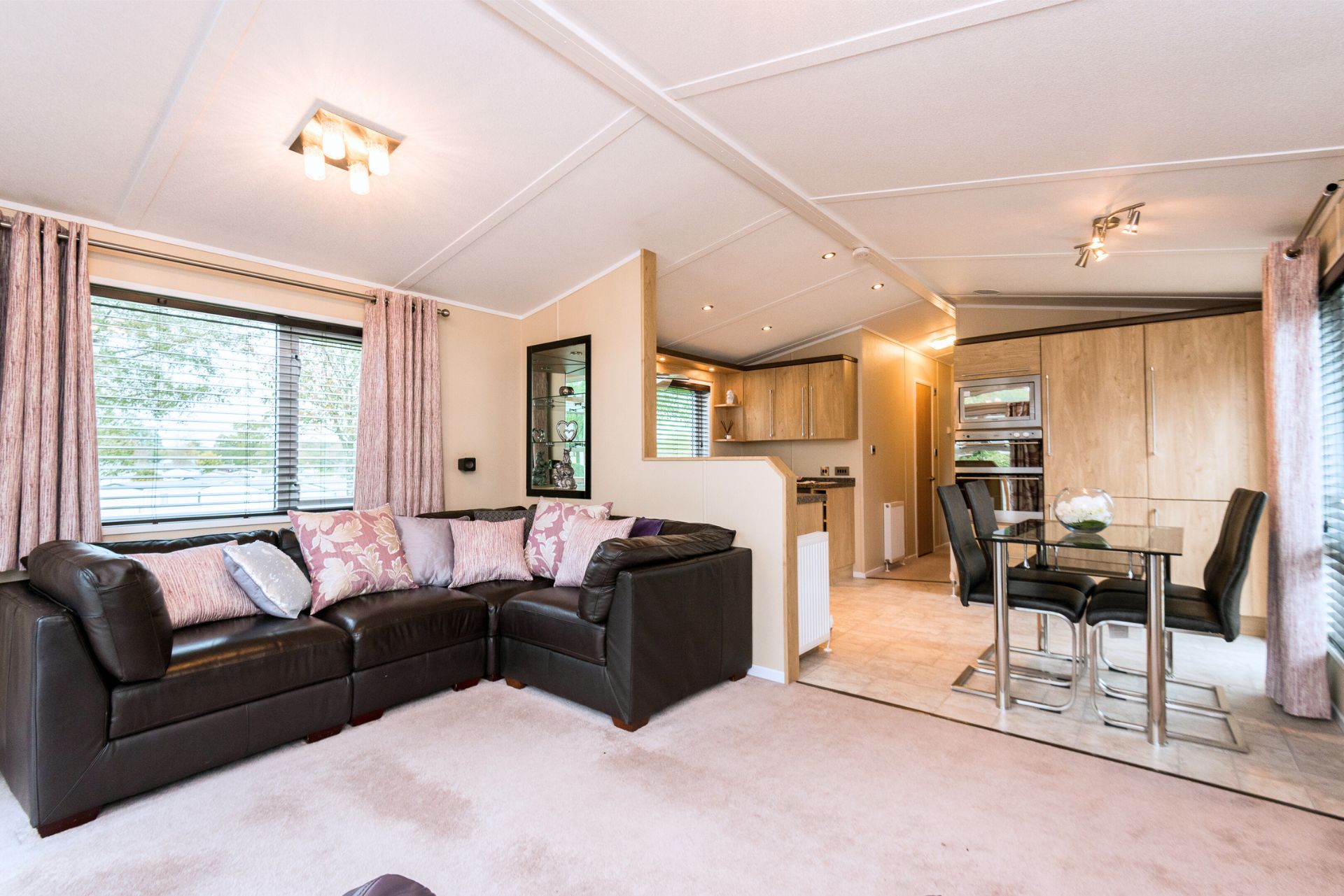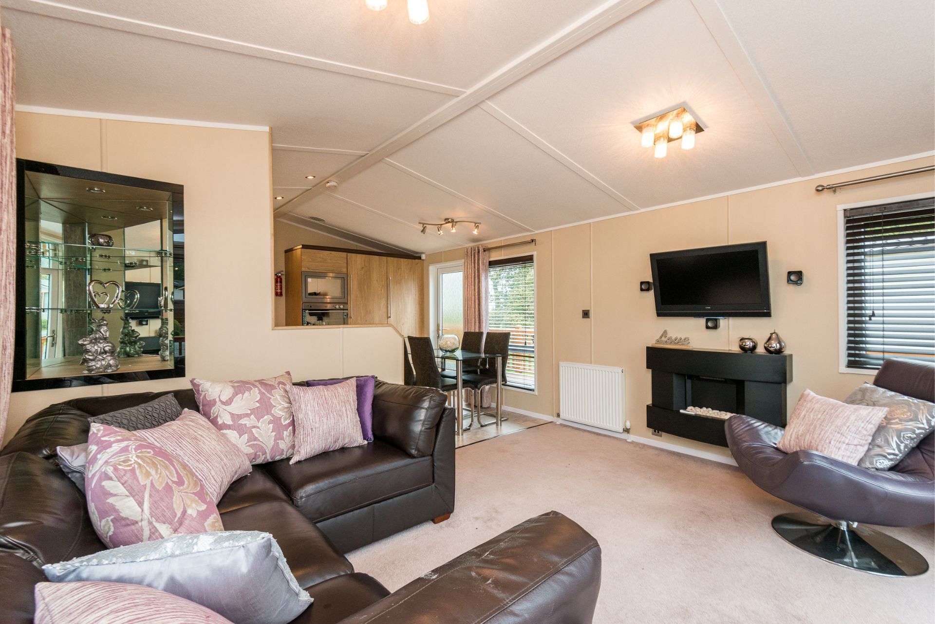 The living area is particularly cosy with carpet throughout, a feature electric fire which is perfect to curl up on the spacious corner sofa. Access your decking from the patio doors to the front elevation.